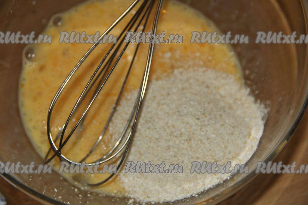 Взбить яйца с молоком с помощью венчика. Добавить измельчённую овсянку и сахар.