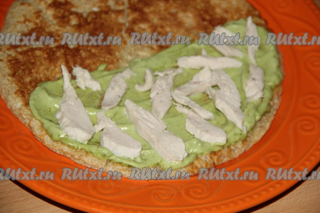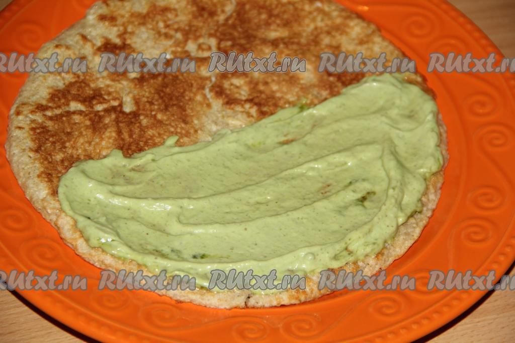 Половину блина смазать любым соусом (например, майонезом или кетчупом), я использовала домашний шпинатный соус.