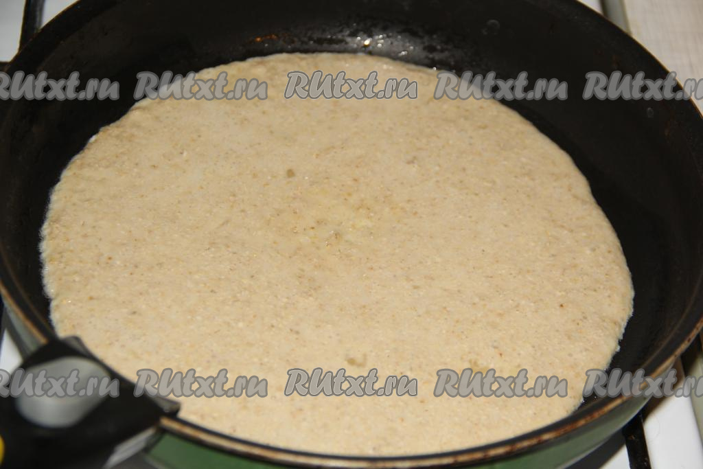 В сковороду диаметром 26 см влить 1 чайную ложку растительного масла, разогреть. Вылить сразу всё тесто и распределить равномерно по всей поверхности сковороды, жарить овсяноблин на среднем огне.