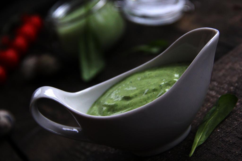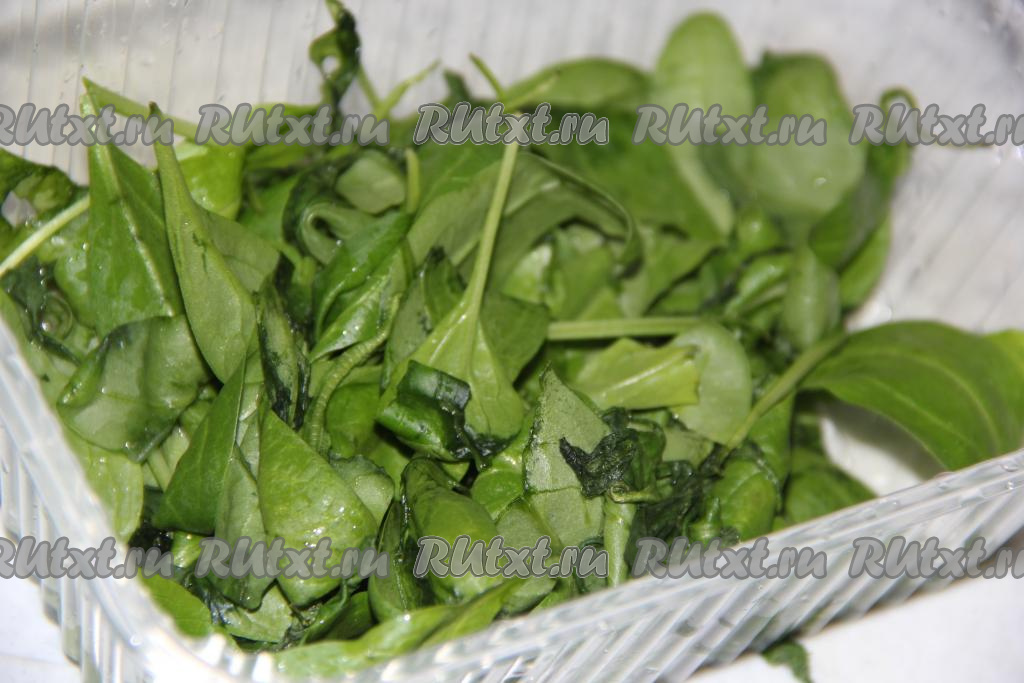 Шпинатный соус готовится по рецептуре майонеза. Поэтому для его приготовления вам понадобится погружной блендер и узкая банка (в которую помещается блендер) или любая другая достаточно узкая тара подходящего размера. Свежий шпинат промыть водой, затем обсушить.