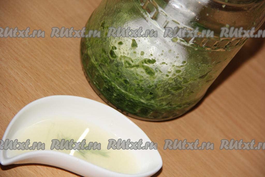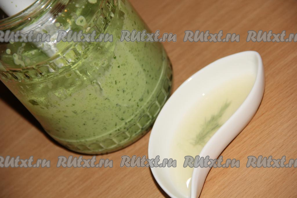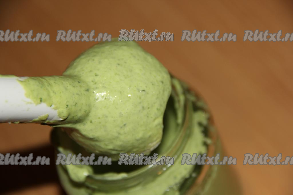 Затем начать понемногу вливать тонкой струйкой растительное масло, непрерывно взбивая массу погружным блендером. Шпинатный соус начнёт постепенно густеть и светлеть. После добавления, примерно, 150 мл растительного масла, можно начать контролировать густоту соуса. Если добавить в общей сложности около 180-200 мл масла, соус получится более густым. Когда вы добьётесь нужной густоты соуса, добавьте лимонный сок и ещё раз пробейте блендером.