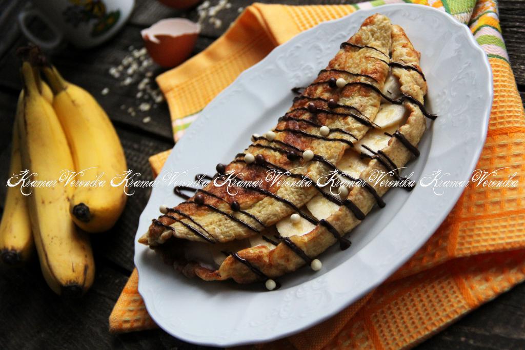 Накрыть начинку второй частью блина. Полить овсяноблин растопленным шоколадом или присыпать сахарной пудрой. Вот такой красивый, пышный, вкусный и сытный овсяноблин с творогом и бананом получился.