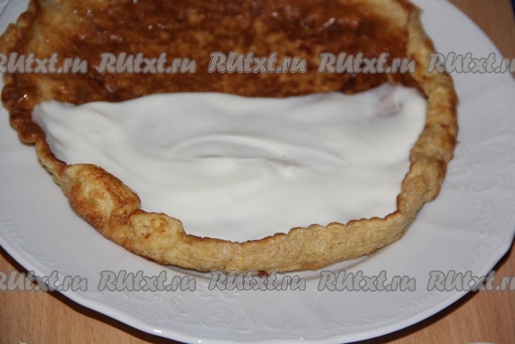 Переложить готовый овсяноблин на тарелку. Смазать половину блина сладким творожком (или творогом, смешанным с сахаром).