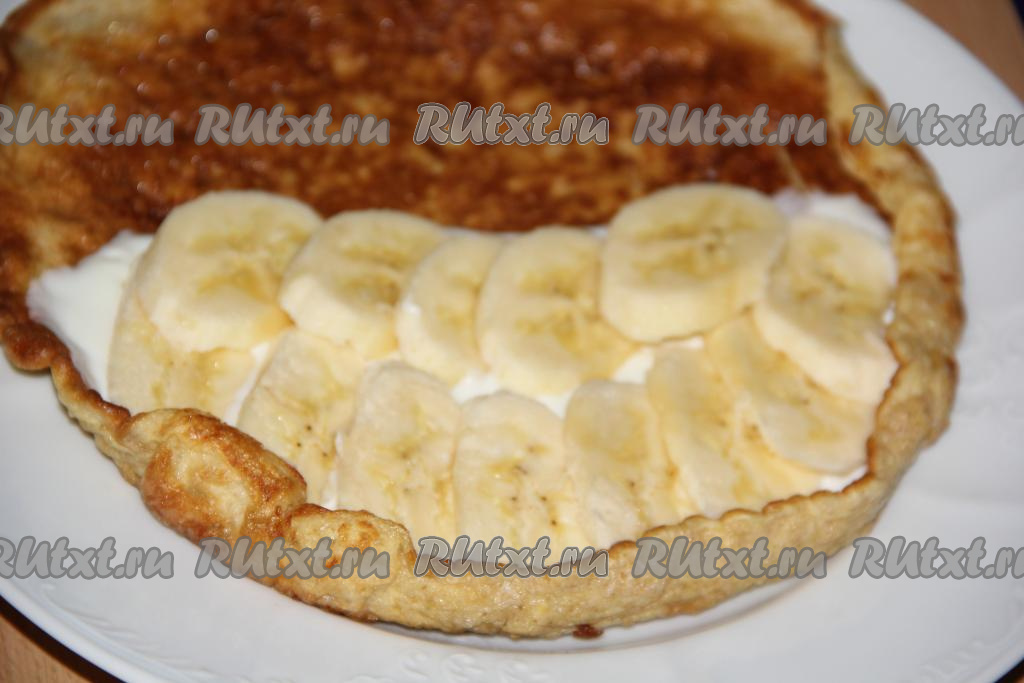 Банан очистить и нарезать тонкими кружочками. Выложить плотным слоем банан на творожный слой.