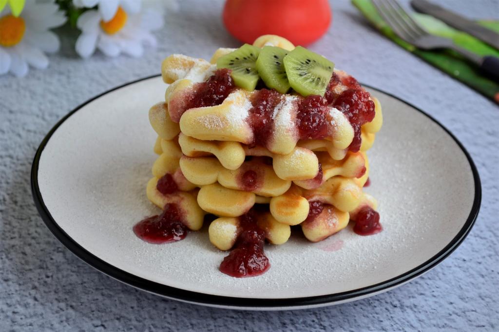Сложить очень вкусные, хрустящие вафли, приготовленные на сметане в электровафельнице, друг на друга, полить джемом, сиропом или вареньем, посыпать сахарной пудрой и можно подавать к столу. Отличная выпечка к чаю или кофе, попробуйте!
