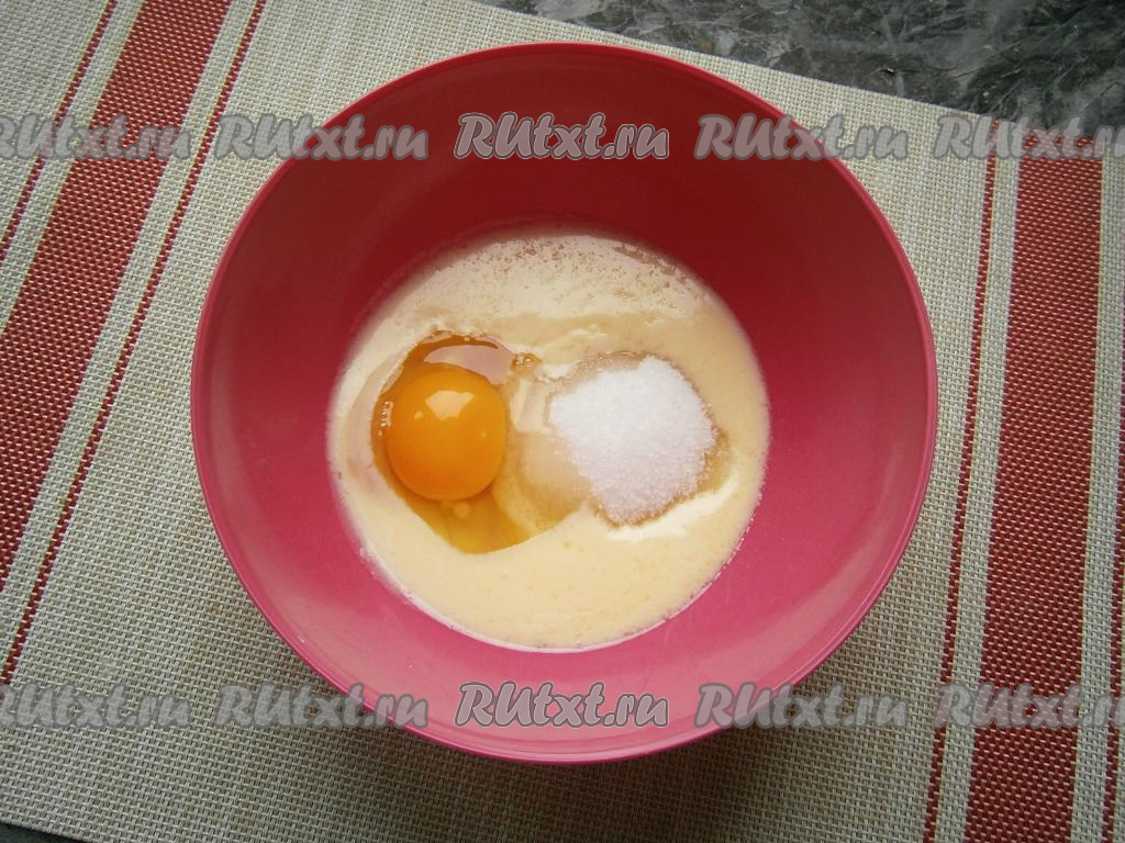 Маргарин растопить и остудить. К остывшему растопленному маргарину добавить сахар, щепотку соли и сырое яйцо.