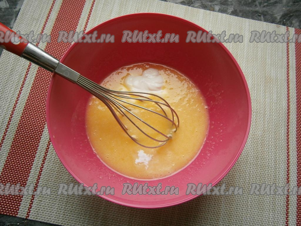 Перемешать получившуюся массу венчиком до однородности, добавить сметану и всыпать щепотку соды.