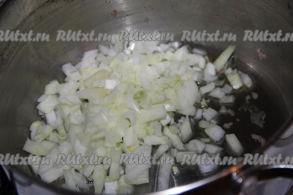 В кастрюлю, в которой будем варить уху, влить 2 столовые ложки растительного масла. Вторую луковицу очистить и мелко нарезать. Поставить кастрюлю на средний огонь и добавить в неё лук (можно, конечно, обжаривать овощи и на сковороде).