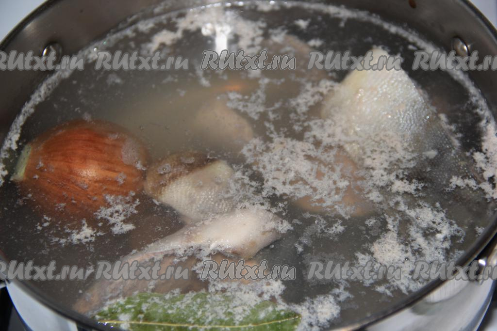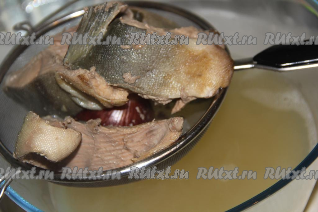 Затем процедить бульон. Варёный лук и лаврушку убрать (они нам больше не понадобятся). Рыбу слегка остудить.