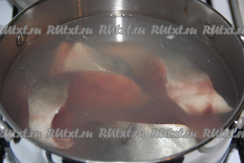 Выложить куски рыбы в кастрюлю и залить 2 литрами холодной воды. Поставить кастрюлю на огонь.