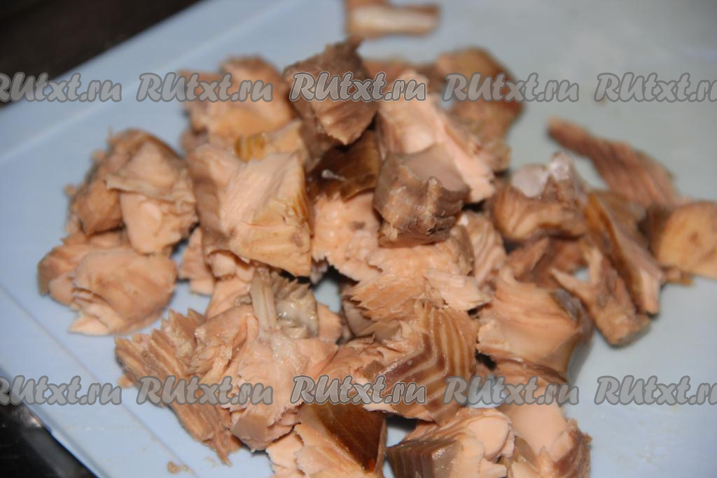 Снять шкурку с рыбы и удалить косточки. Поломать рыбное филе на крупные кусочки.