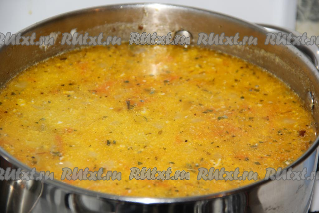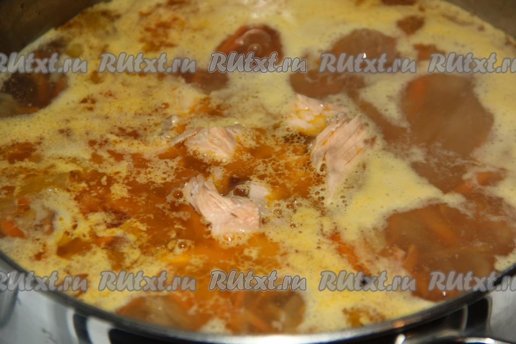 Когда картошка будет практически готова, влить сливочную массу в кастрюлю, перемешать и посолить уху из горбуши по вкусу, потомить на медленном огне в течение 5-7 минут и снять с огня.