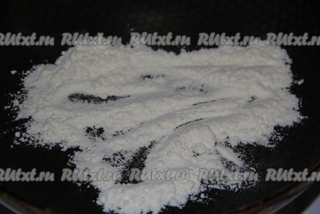 Разогреть сухую сковороду, насыпать муку и обжарить её в течение 2 минут на среднем огне, помешивая, затем, постоянно помешивая, постепенно влить сливки