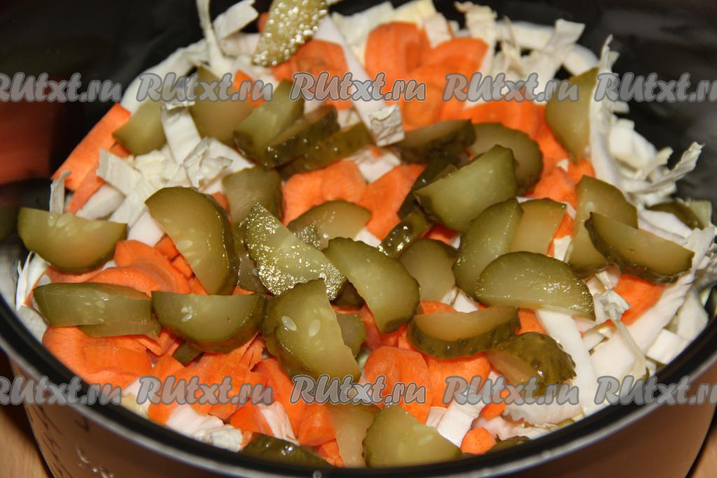 Огурчики нарезать на кружочки (или полукружочки) и тоже добавить в чашу.