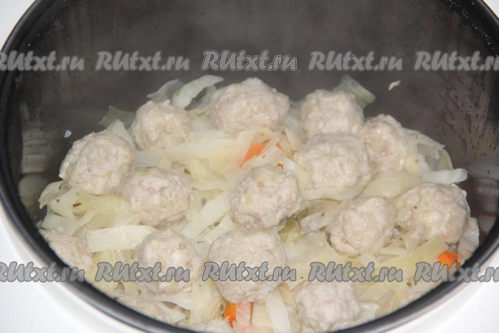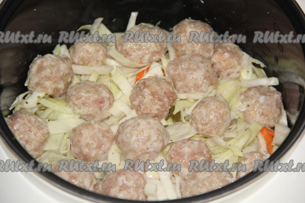 Сформировать круглые фрикадельки и выложить их на капусту в чашу мультиварки.