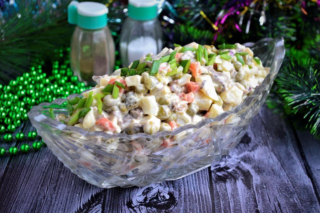 Любимый, очень вкусный салат "Оливье", приготовленный с языком свиным, выложить в салатник, украсить измельчённым зелёным луком и подать к праздничному столу.