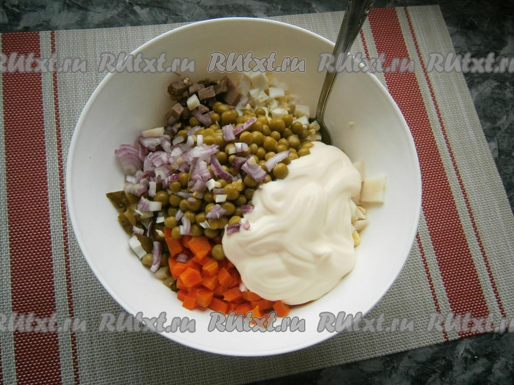 Картошку, язык, яйца, огурцы и морковь сложить в большую миску, добавить консервированный горошек.