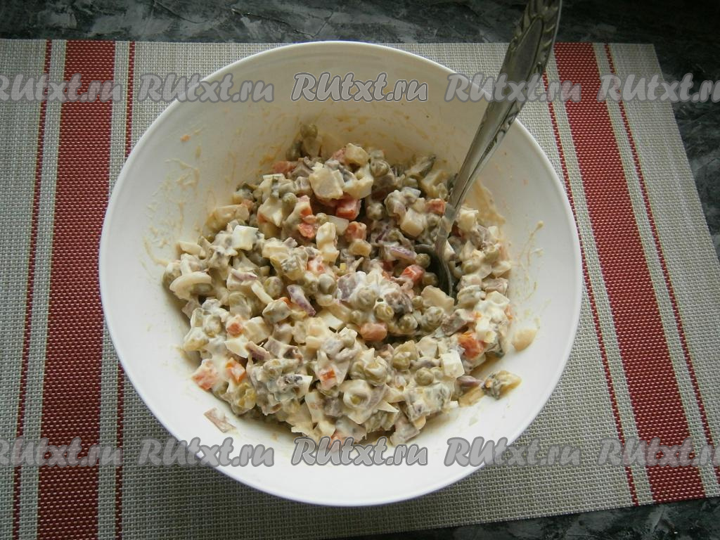 Заправленный салат "Оливье" тщательно перемешать и охладить в холодильнике минут 20.