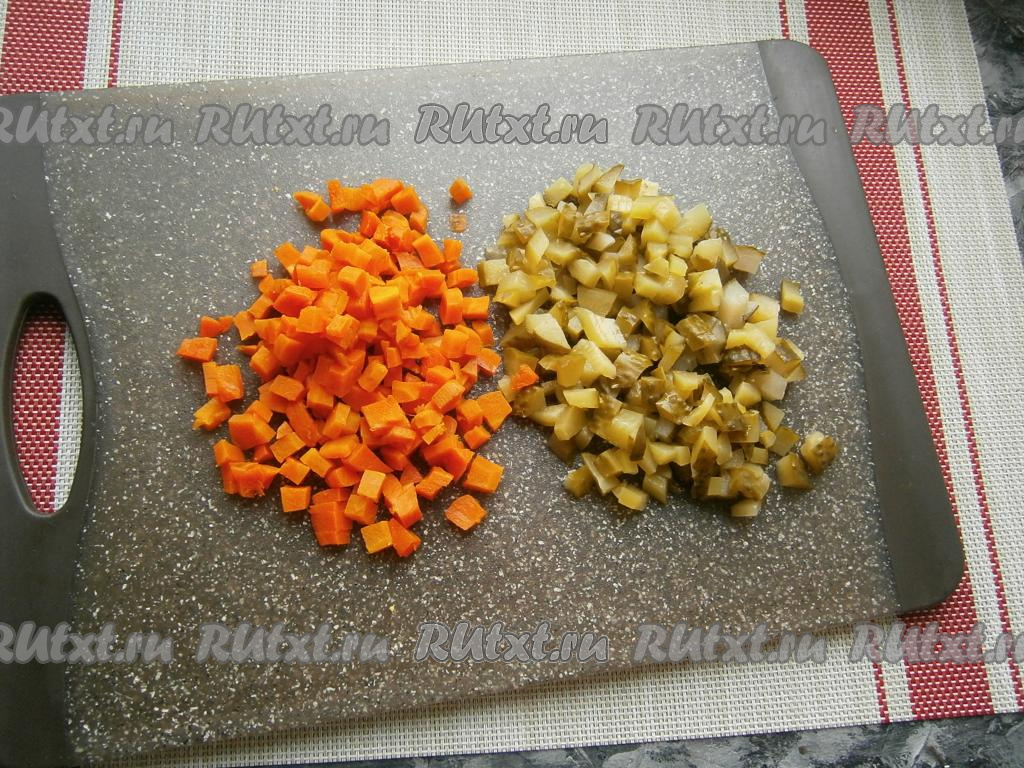 Варёную морковку и маринованные огурцы нарезать также небольшими кубиками.