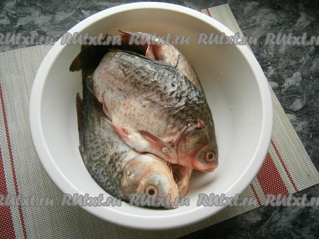 Очистить карасей от чешуи, затем удалить внутренности и жабры. Если не любите голову и хвост, удалите их. Рыбу тщательно вымыть.