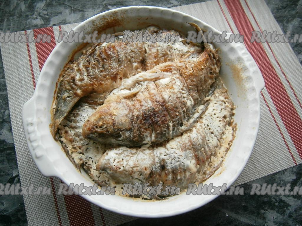 Форму с карасями в сметане накрыть листом фольги и отправить в разогретую до 180 градусов духовку на 45-50 минут.