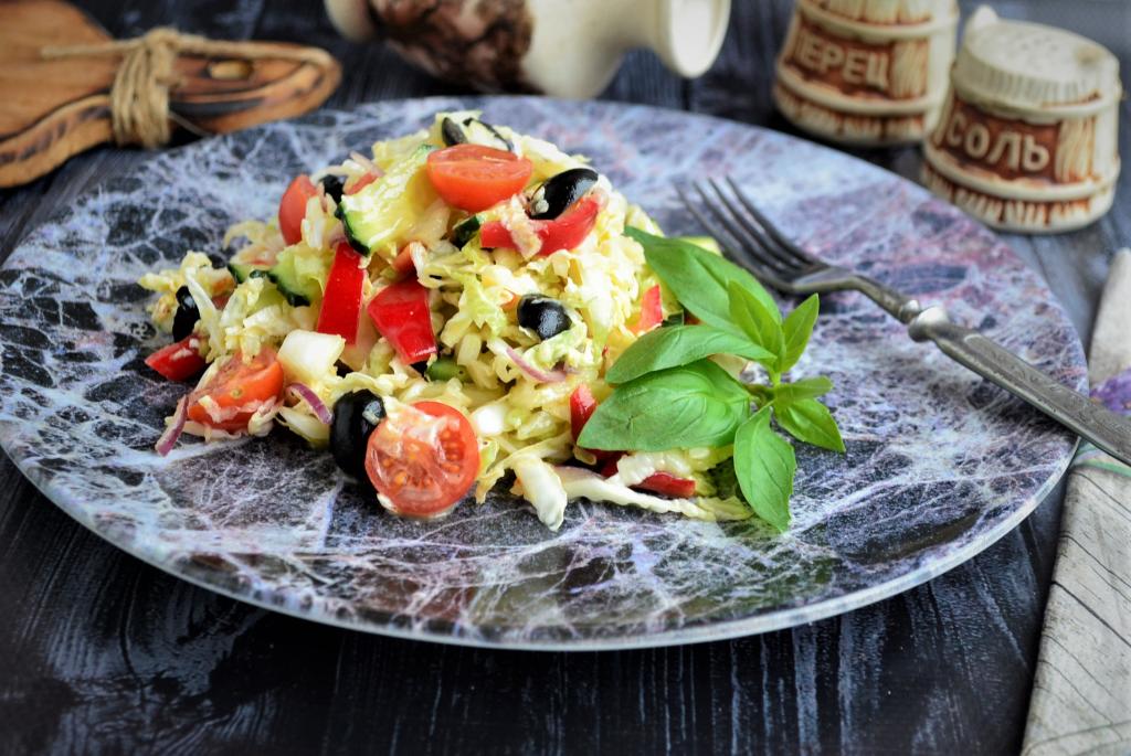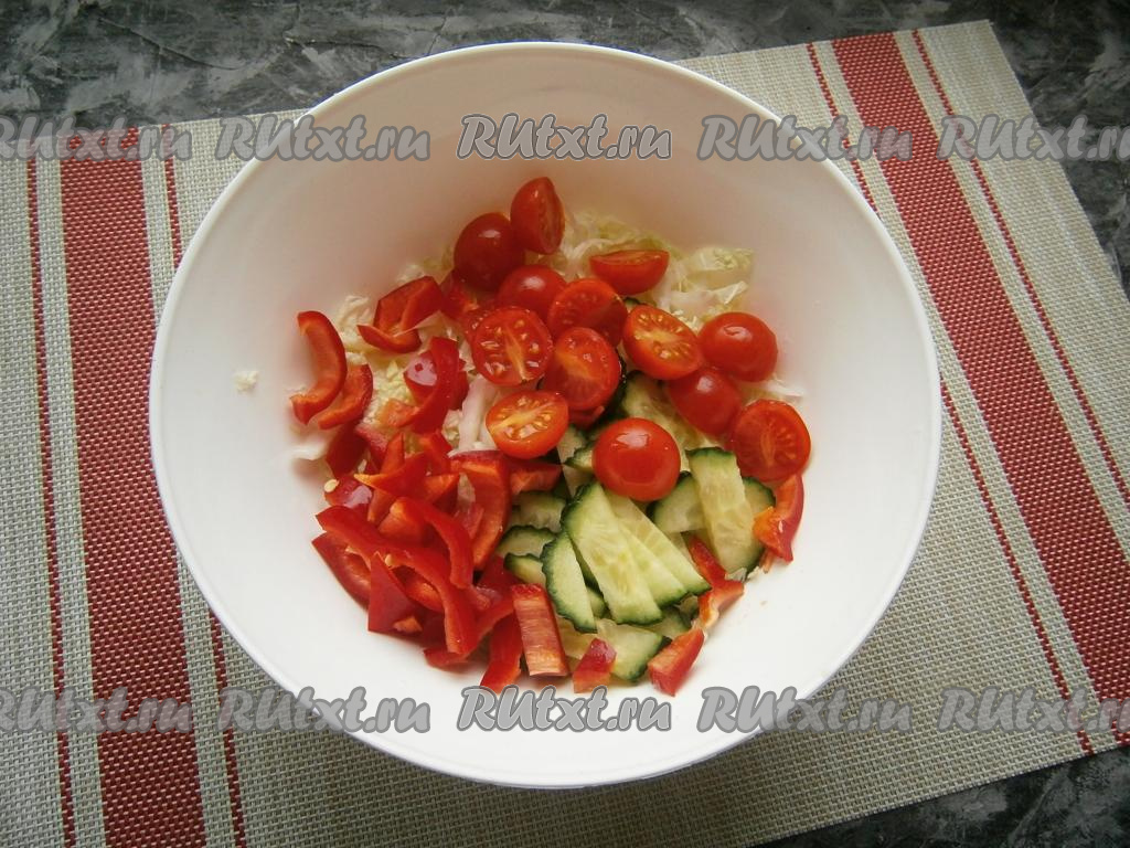 Салат, приготовленный из пекинской капусты с добавлением помидоров, болгарского перца и огурцов, - простое, яркое, полезное и очень вкусное блюдо, которое можно подать не только к обеду или ужину, но и к праздничному столу. Этот салатик станет великолепным дополнением к запечённой рыбе или мясу. Лёгкий, хрустящий салат вам точно понравится!