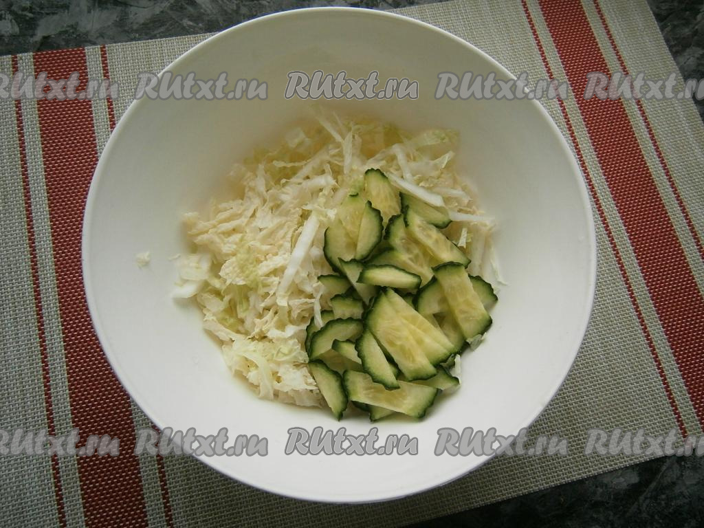 Удалить из болгарского перца семена, очистить лук. Нашинковать пекинскую капусту, чуть её посолить и нежно помять руками, затем добавить нарезанный полукружочками свежий огурец.