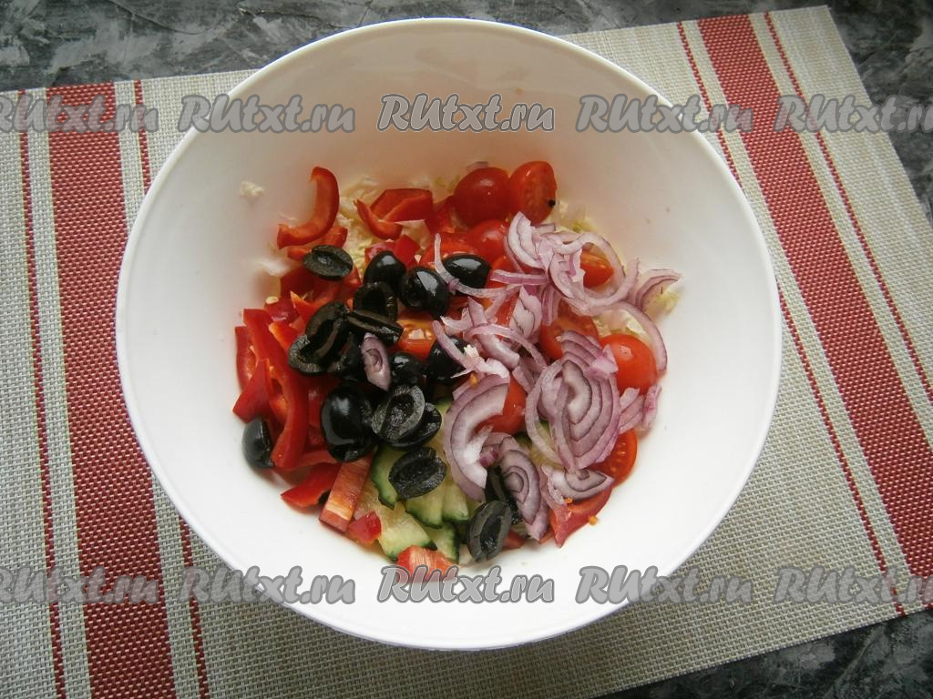 Сюда же добавить нарезанный тонкими полукольцами лук и чёрные оливки, разрезанные пополам.