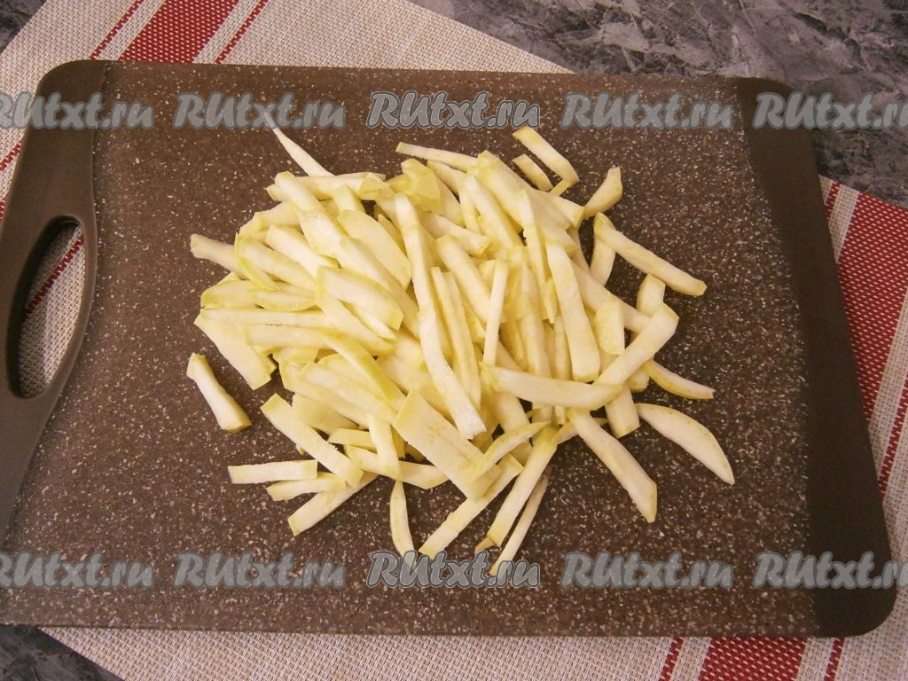 Кабачок (или цукини) очистить от кожуры (если кожица тонкая, можно готовить и вместе с кожурой), нарезать тонкой соломкой.