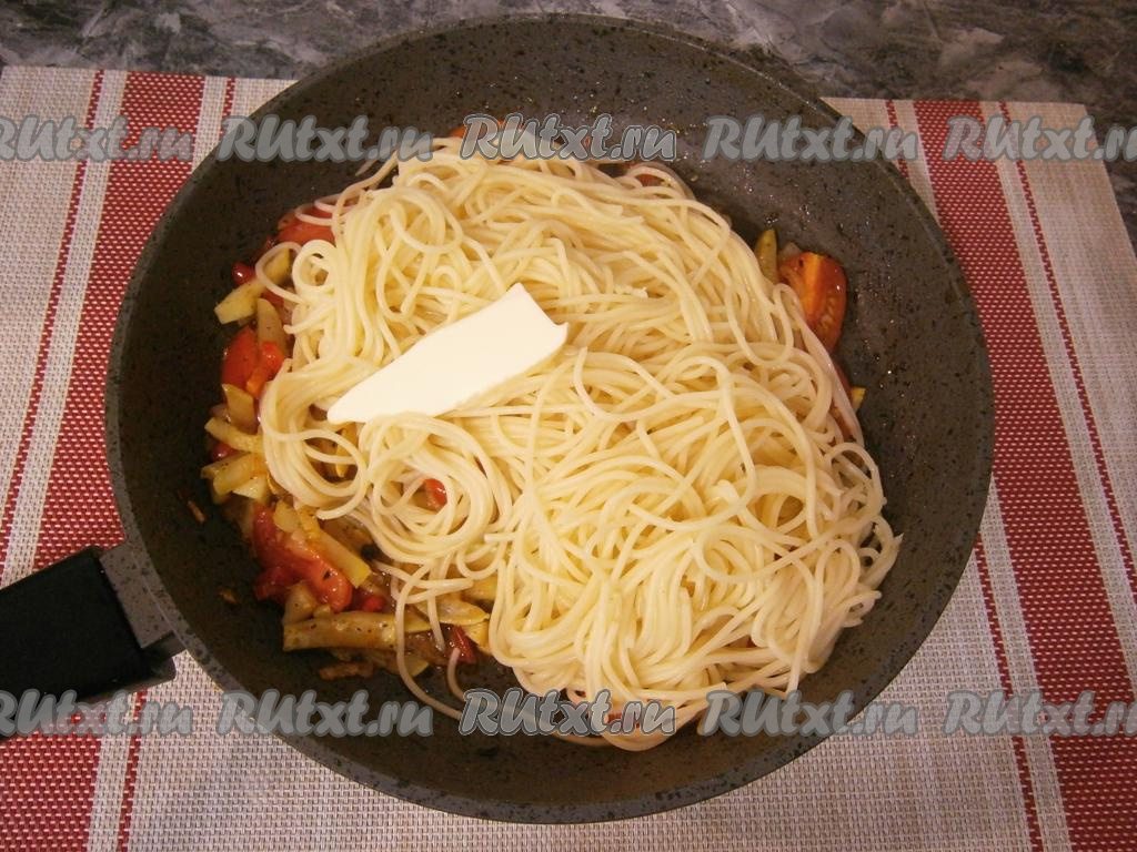 Перемешать овощи, прогреть на слабом огне пару минут и добавить на сковороду отваренные спагетти. Сверху выложить кусочек сливочного масла.
