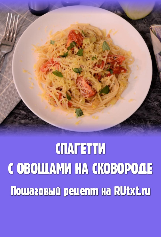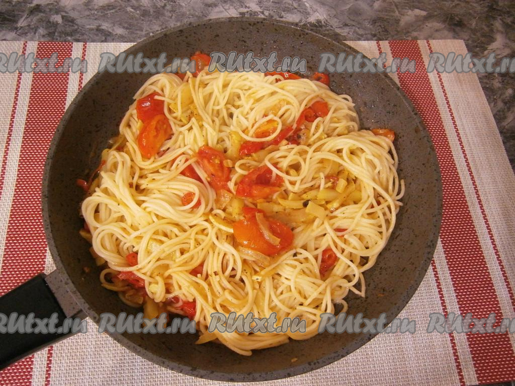 Хорошенько перемешать, прикрыть сковороду крышкой и на медленном огне прогреть спагетти с овощами около 2-3 минут.