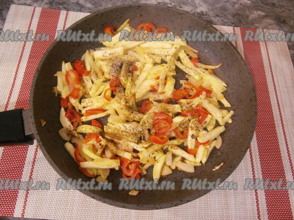 Разогреть сковороду с растительным маслом, выложить лук и болгарский перец, обжарить их на среднем огне, помешивая, минуты 3-4. Затем добавить кабачки, перемешать и обжаривать ещё 4-5 минут, иногда перемешивая.