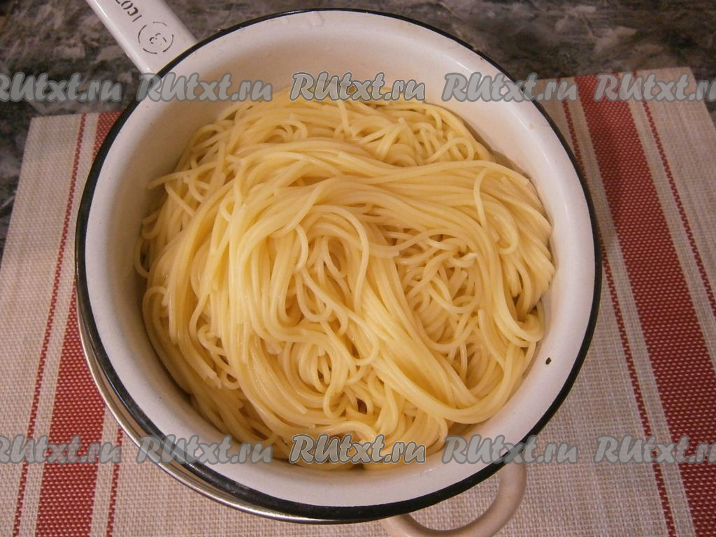 Поместить спагетти в кипящую подсоленную воду и отварить до готовности (в соответствии с инструкцией на упаковке), затем откинуть их на дуршлаг.