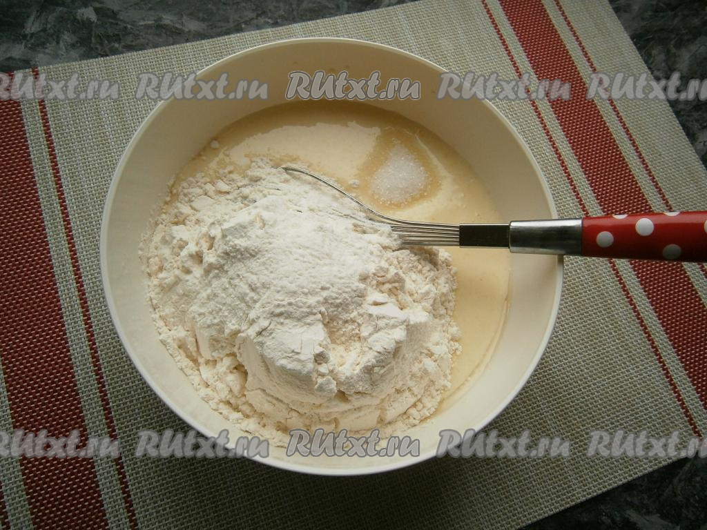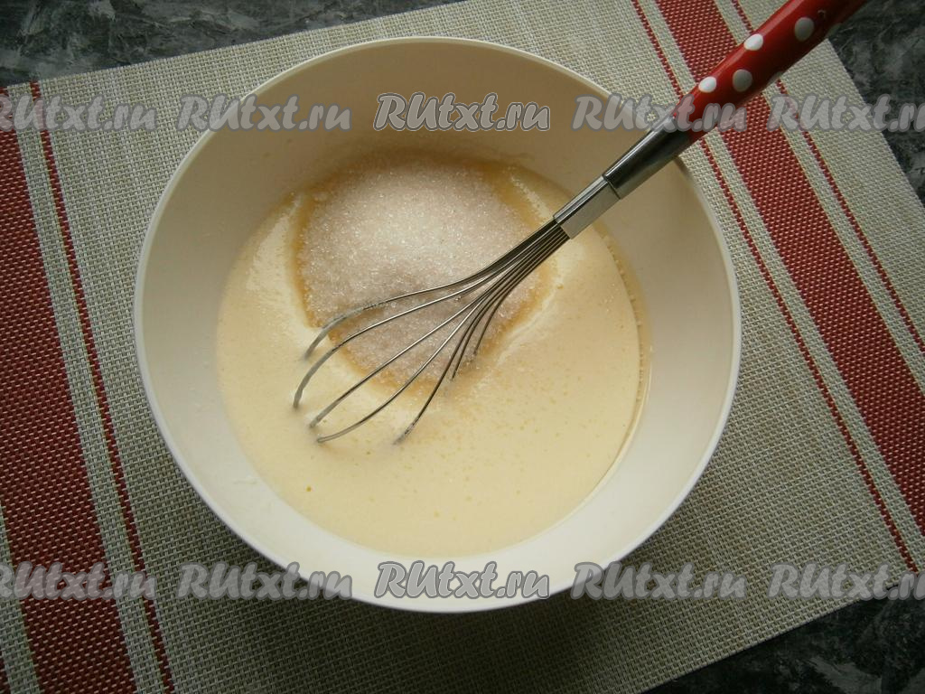 Хорошенько перемешать венчиком (до однородности). Всыпать сахар и соль, снова перемешать.
