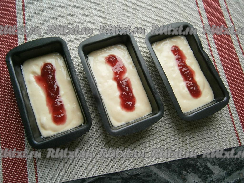 Сверху выложить по 1 чайной ложке густого джема. У меня формочки прямоугольные, джем я распределила почти по всей длине формочек.
