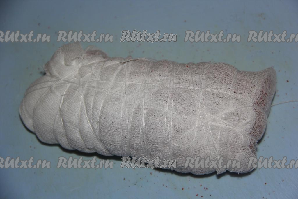 Плотно завернуть куриное филе в специях в марлю (или хлопчатобумажную ткань), замотать ниткой. Марля защитит бастурму от пыли и насекомых.