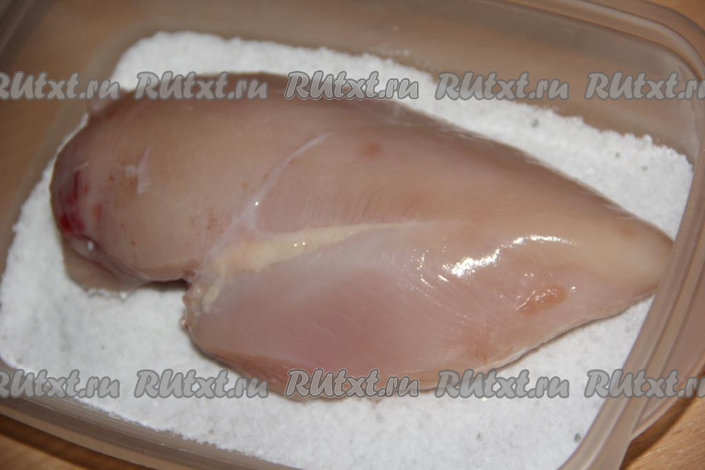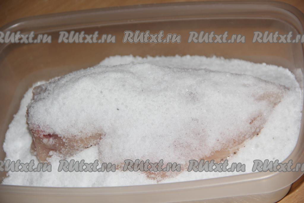 Поверх филе насыпать ещё грамм 300 соли. Соль должна полностью покрыть мясо. Поставить лоток с филе в холодильник на 1 сутки.