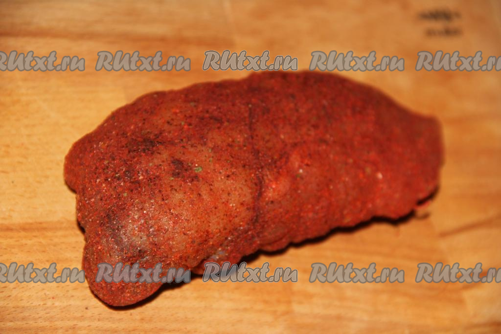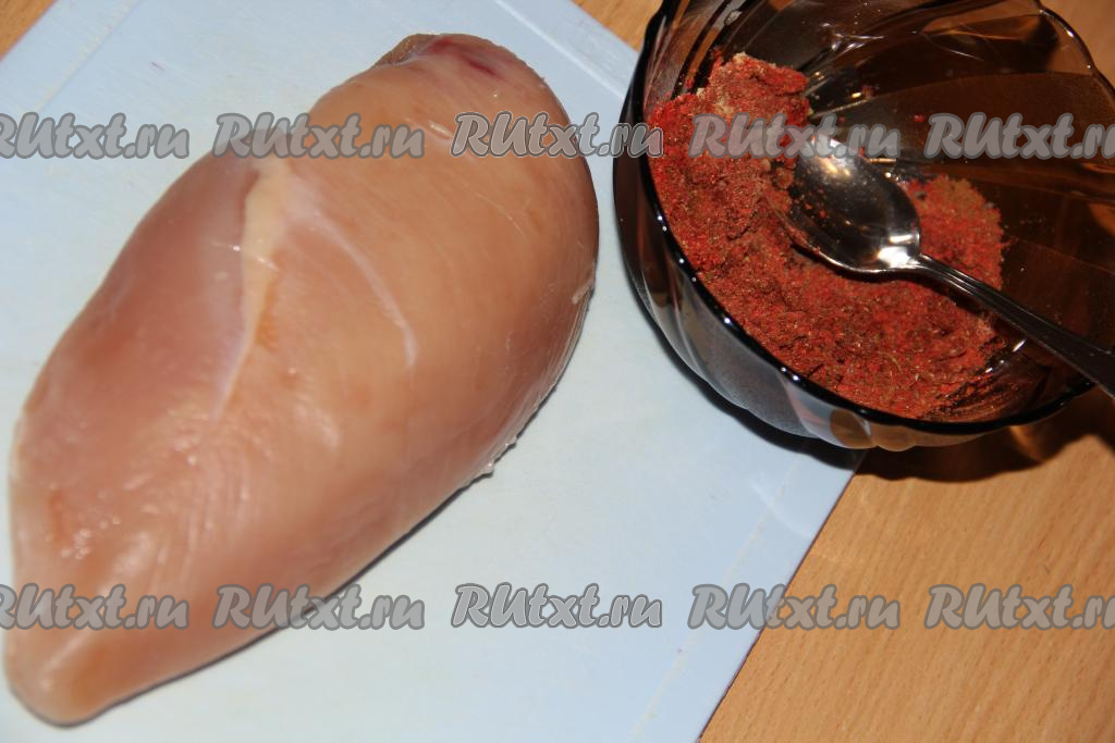 Куриное филе тщательно обмазать специями так, чтобы специи покрывали мясо плотной оболочкой со всех сторон.