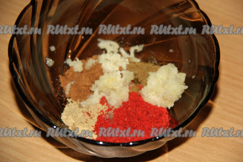 Соединить хмели-сунели, сушёный имбирь, паприку и мускатный орех, добавить чеснок, пропущенный через пресс.