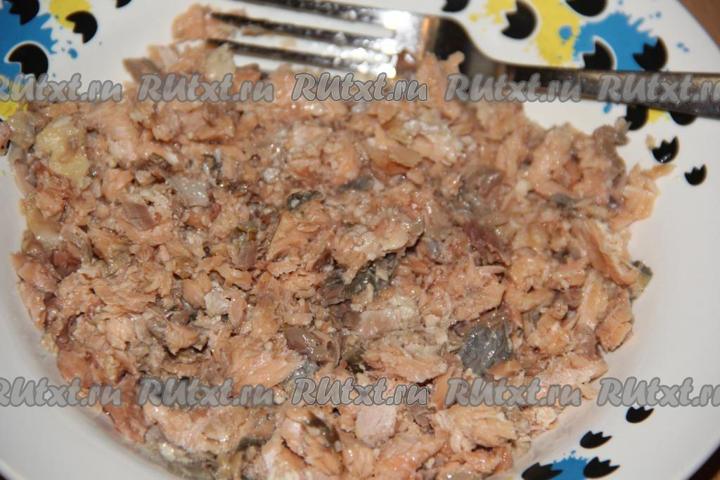Из банки с консервами слить масло и размять рыбу вилкой. Я взяла консервы из горбуши, приготовленные в домашних условиях, можно использовать любые покупные рыбные консервы в масле.