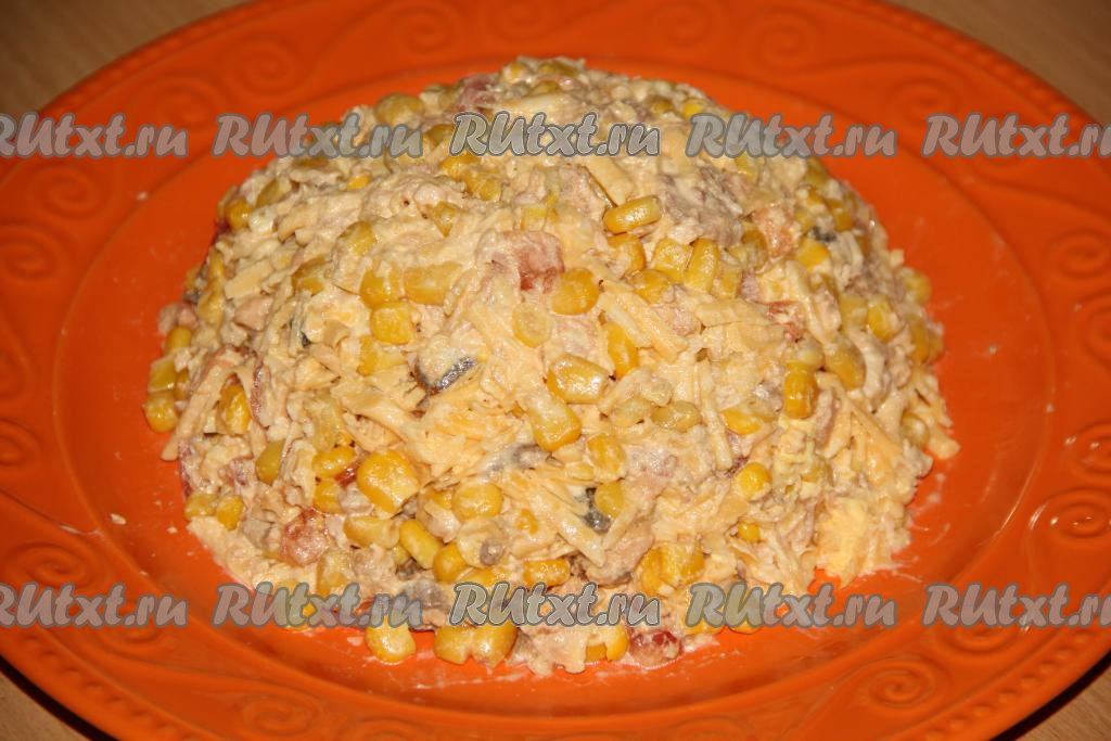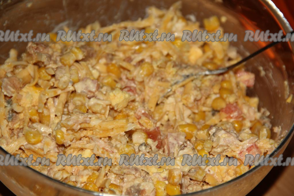 Слегка посолить салат из сыра, помидоров, яиц, рыбных консервов и кукурузы, добавить майонез.