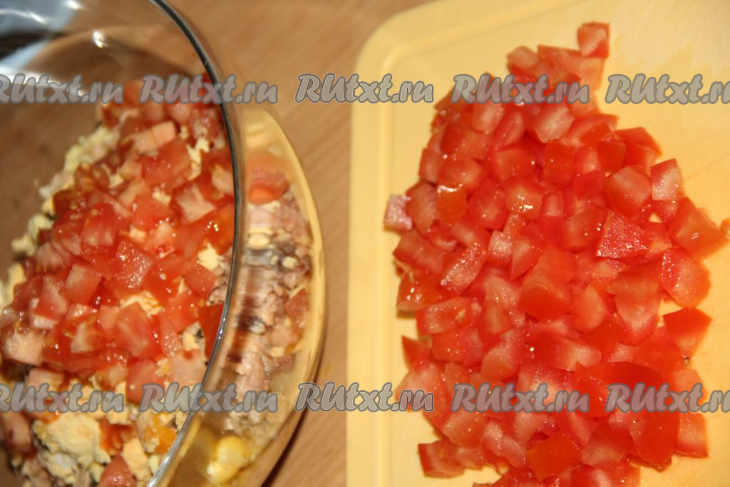 Верх салата покрыть кусочками помидоров (как на фото). Слой должен быть плотным.