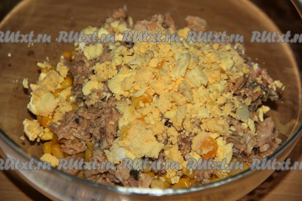 Яйца предварительно сварить вкрутую (варить 10 минут с момента закипания воды) и остудить. Отделить белки от желтков. Желтки раскрошить в салат из консервированной рыбки и кукурузы. А белки отложить для украшения салата.