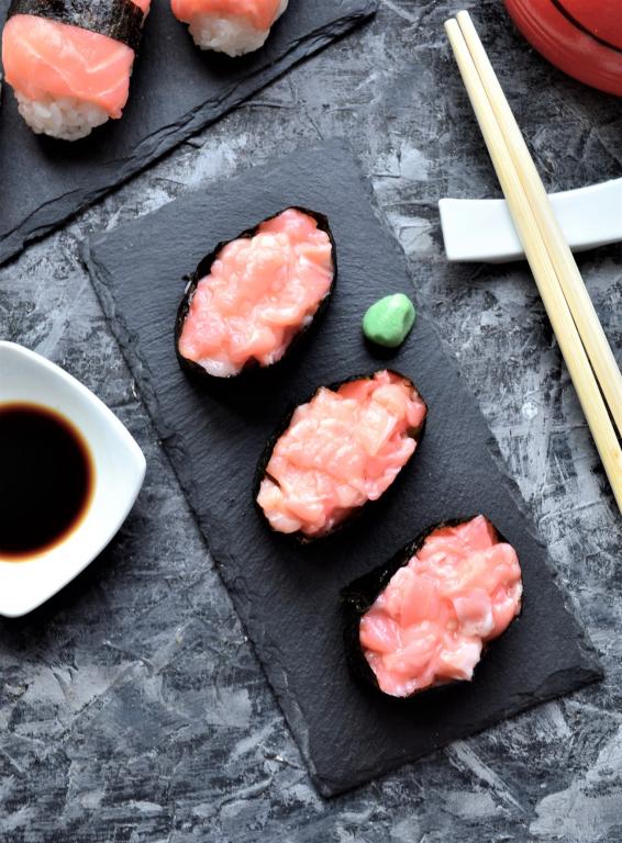 Вот и всё, замечательные гункан суши можно подавать к столу, красиво выложив на блюдо. К ним нужно обязательно подать острую горчицу васаби и, конечно же, соевый соус.