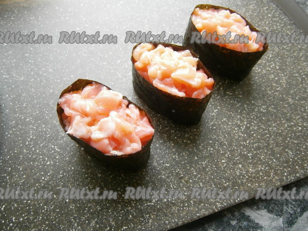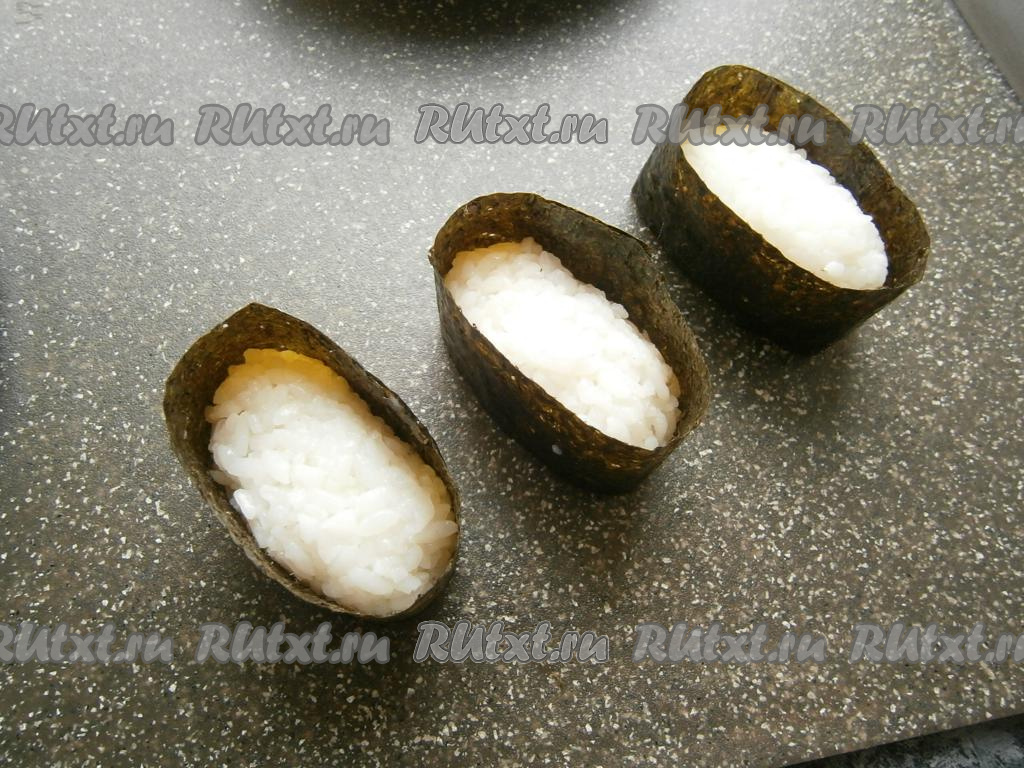 Лист нори нарезать на прямоугольники, рассчитав высоту так, чтобы лист был выше брусочков риса на 1-2 см. Рисовые брусочки обернуть нарезанными листами нори, конец склеить водой (или рисинкой). Получатся такие своеобразные "чашечки".
