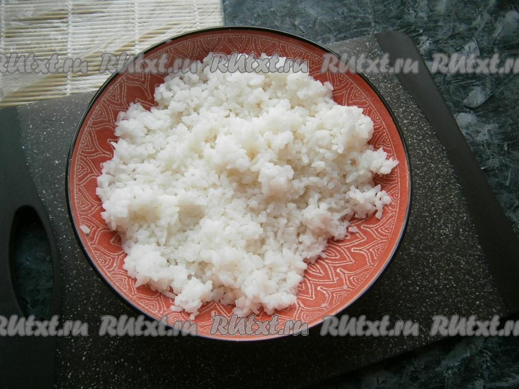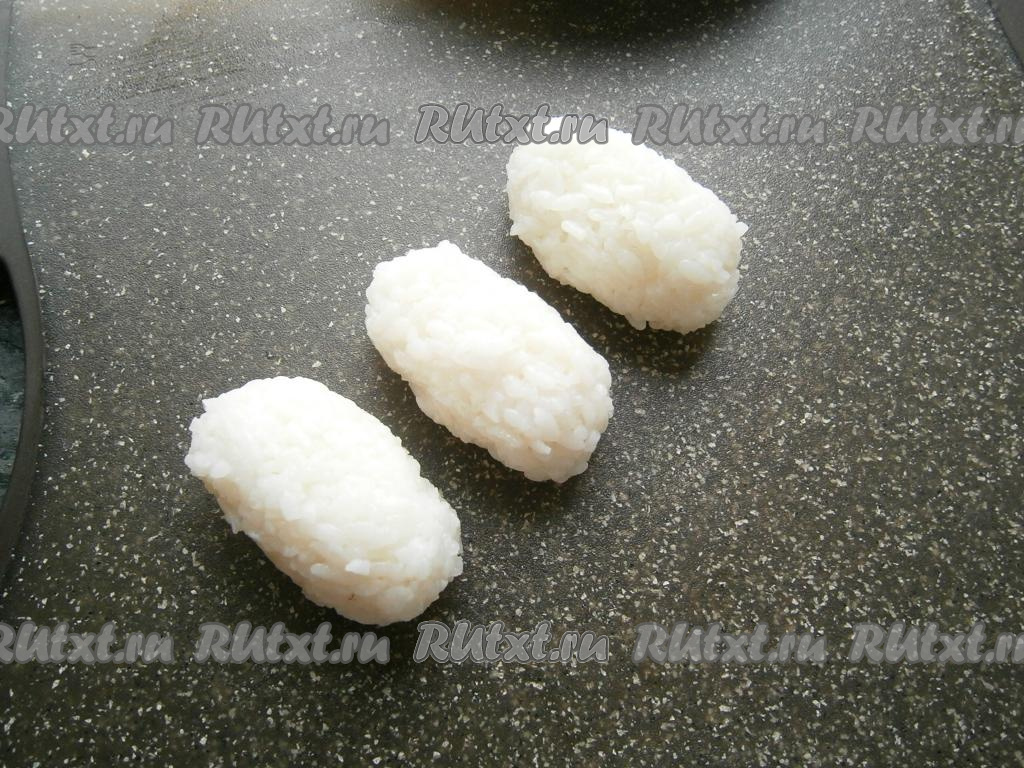 Из риса сформировать, хорошо прессуя рукой, небольшие брусочки весом около 30 грамм.