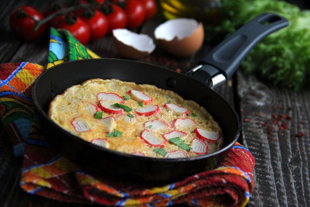 Накрыть сковороду крышкой и готовить омлет на медленном огне в течение 5-7 минут. На поверхности готового омлета не должно быть примесей сырого яйца. Аппетитный, очень вкусный, нежный омлет с крабовыми палочками подать в горячем виде с мелко нарезанной зеленью. Это блюдо и насытит, и порадует яркими красками, попробуйте!