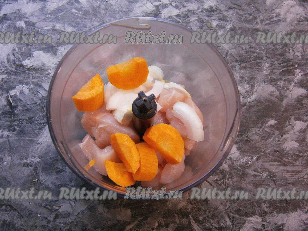 Кусочки куриного мяса выложить в чашу блендера, сюда же добавить нарезанные кусочками лук и морковку.
