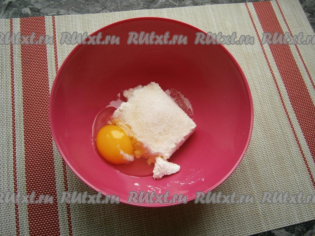 К творогу добавить яйцо, всыпать 1 столовую ложку сахара, соль и 0,5 чайной ложки ванильного сахара.