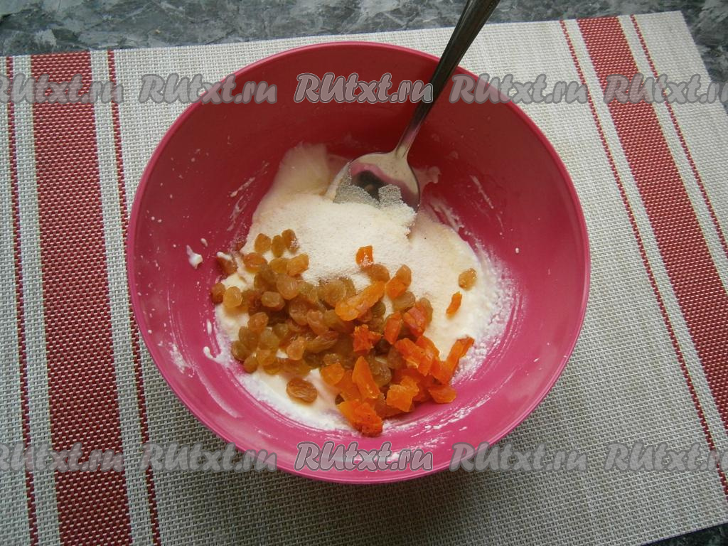 Всыпать манную крупу, добавить мелко нарезанную курагу (если слишком сухая - замочите в кипятке на 10 минут и обсушите) и изюм.